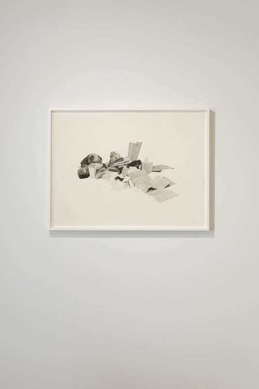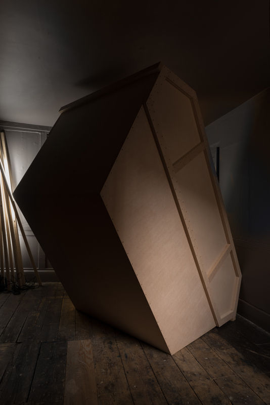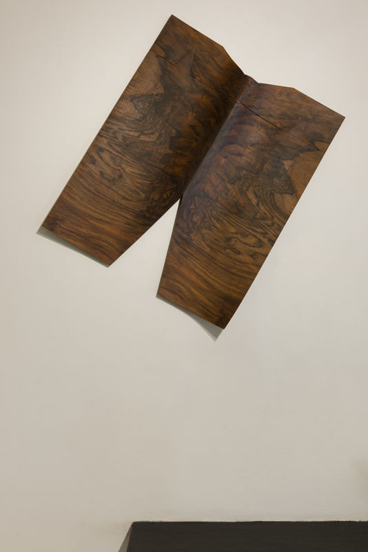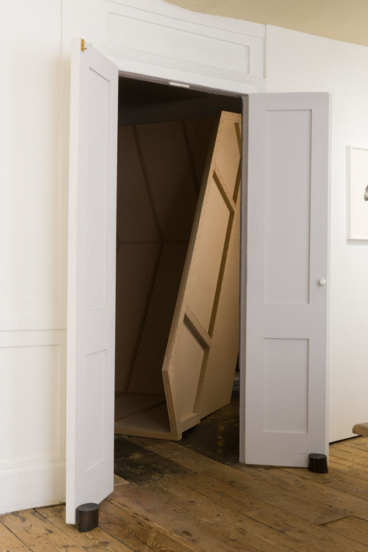 Central to the exhibition are themes of balance and counterbalance, real and phantom, be it through intricate ink drawings of objects or in drawings in sculptural form. Every element sits together to create a walk-through still life of Richardson’s making. The title piece of the show, If I measure it must exist, is made from a length of pine cut into three pieces and folded. Resting somewhat provisionally on the edge of a fire place, it evokes a hinged ruler recently put down after use. Unpredictably, however, this ‘ruler’ has no numbers, with only its wild grain and the artist’s rhythmically gauged marks suggesting anything against which to measure.